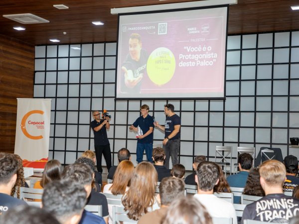 O dia começou com a palestra "É Lúdico, Mas o Papo É Sério", com o palestrante, mágico e pesquisador de competências humanas, Marco Zanqueta. Marco utiliza a mágica como ferramenta educacional para gerar engajamento, reflexão e aprendizado real, conectando comportamento humano, atitudes e resultados. "O jovem quer participar, quer aprender, mas eles têm um jeito diferente de interagir, e a minha metodologia busca isso, aprender brincando, se divertindo. Trouxemos princípios de liderança, cooperativismo e comprometimento. Agradeço a participação de cada um, mas especialmente agradeço a Copacol por trazer esse olhar diferente para os jovens", relata o palestrante.